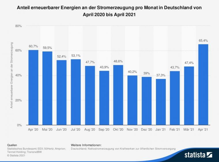 2021. Im April 2021 betrug der Anteil an der Stromerzeugung in Deutschland rund 65,4 %. Der Durchschnittswert für das Jahr 2021 lag bei insgesamt 43,8 %.