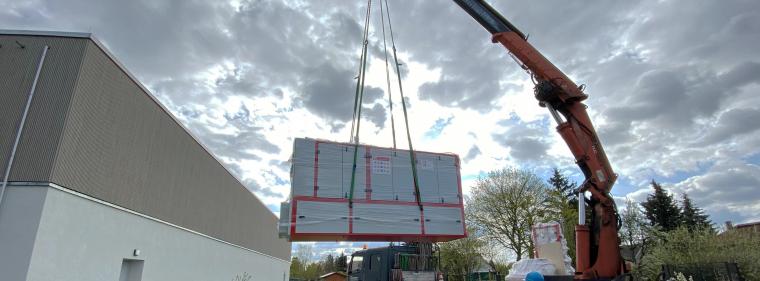 der Sporthalle: Am 5. Mai wurde das Aggregat für das BHKW in Petershagen-Eggersdorf (Brandenburg) angeliefert. Es ergänzt