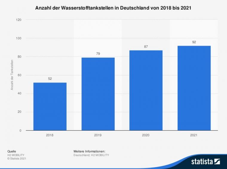 Die Statistik zeigt die Anzahl der Wasserstoff-Tankstellen in Deutschland in den Jahren 2018 bis 2021 (Stand: Juni). Fahrzeuge mit Brennstoffzellenantrieb gewinnen ihre elektrische Energie aus dem Energieträger Wasserstoff, der an dafür vorgesehenen Tankstellen getankt werden kann. Zum Zeitpunkt Juni 2021 lag die Anzahl der Wasserstoff-Tankstellen auf deutschem Boden bei 92, im Vergleich zu 2018 ein Zuwachs von rund 77 %.
